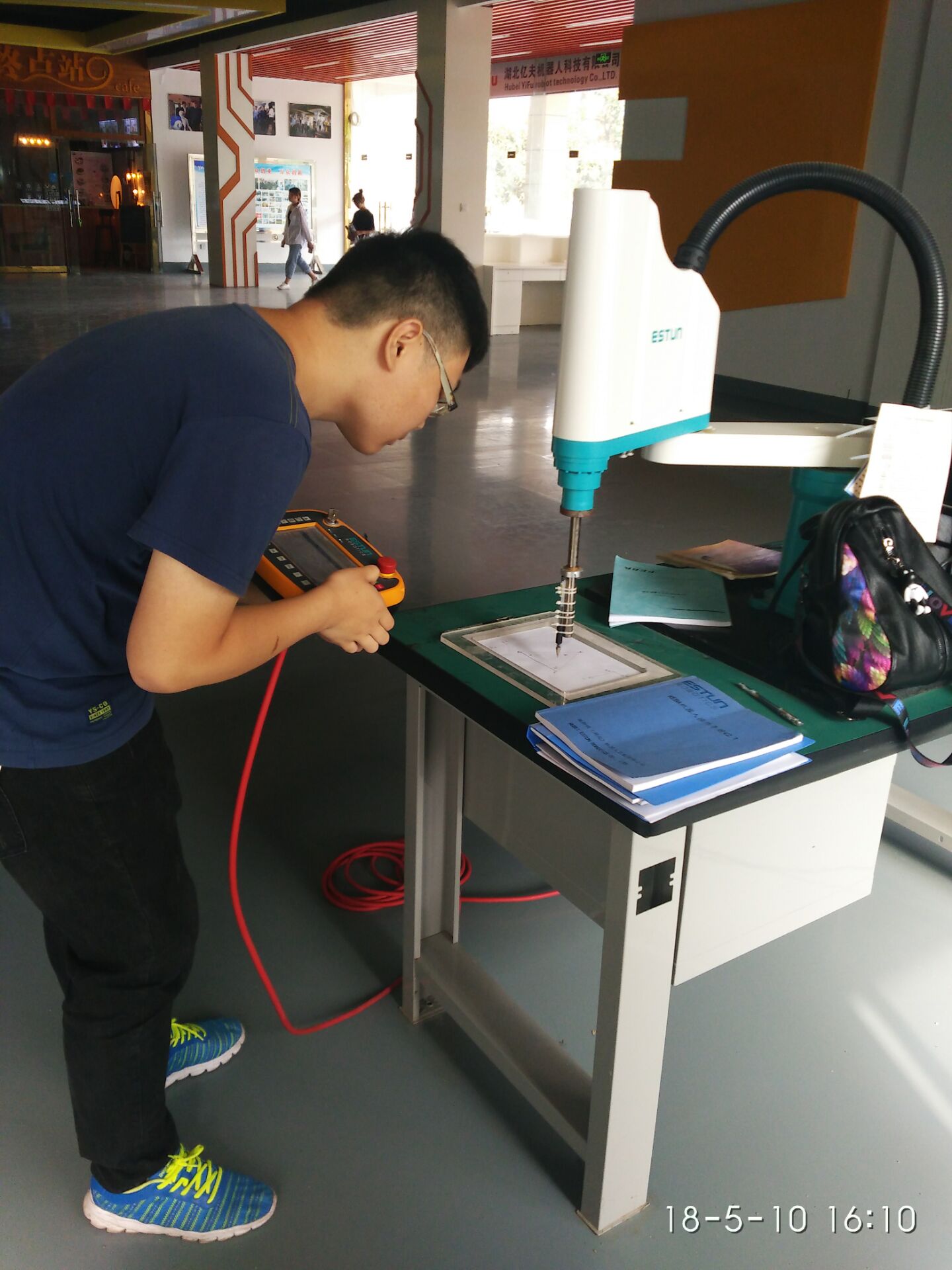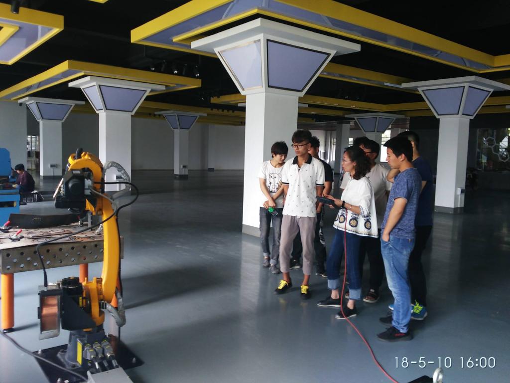 汽车学院工业机器人技术专业2016年开始招生,学生经过一年级的专业基础学习,开始强化实践操作训练。2016年汽车学院与亿夫机器人科技有限公司合作,注册湖北亿夫机器人有限公司,在学院建设机器人博览中心和工业机器人实训中心,并于2017年初正式启用。期间制造类教研室多次派出专业教师外出学习,为该专业储积师资力量。青年教师勇挑重担,王军、龚素芬等老师主动承担该专业课程建设和教学工作,克服困难,积极学习,带动专业团队顺利完成专业技能转型。通过学习,老师们熟练掌握工业机器人示教编程、电气系统集成控制、实践操作技能等,完全胜任该专业理论和实践教学。