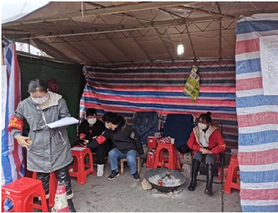 每天去村口的卡点负责交通管制值班,检查进出车辆是否有通行证,给他们测量体温,并劝导有些村民不要外出,工作环境是一个临时搭建的简易棚,由于是在山村里,晚上气温很低,夜班只有一张折叠床可以躺着休息一会,一有车辆过来立马起来做检查。白班需要去各个村街道巡逻,劝导村民不要扎堆聚集,告知他们现在疫情的严重性,劝导他们做好个人防护。