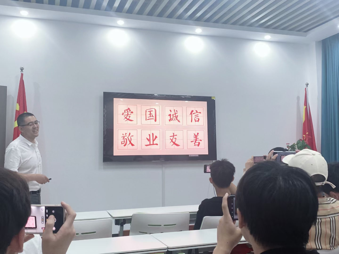 王书记从核心价值观的科学内涵、发展历程、重大意义和培育践行四个方面进行了深入解读,并结合自己在学习、生活和工作中的感悟,与同学们进行了深入的交流。同学们认真听讲,个别同学还对社会主义核心价值观提出了自己的认识和理解,讲座现场气氛热烈;王书记认为,核心价值观的养成绝非一日之功,要坚持由易到难、由近及远,努力把核心价值观的要求变成日常的行为准则,进而形成自觉奉行的理想信念。同时,他期望同学们能够积极践行社会主义核心价值观,做到坚定不移地听党话、跟党走,怀抱梦想又脚踏实地,敢想敢为又善作善成,立志做有理想、敢担当、能吃苦、肯奋斗的新时代好青年,让青春在建设社会主义现代化国家的火热实践中绽放绚丽之花。