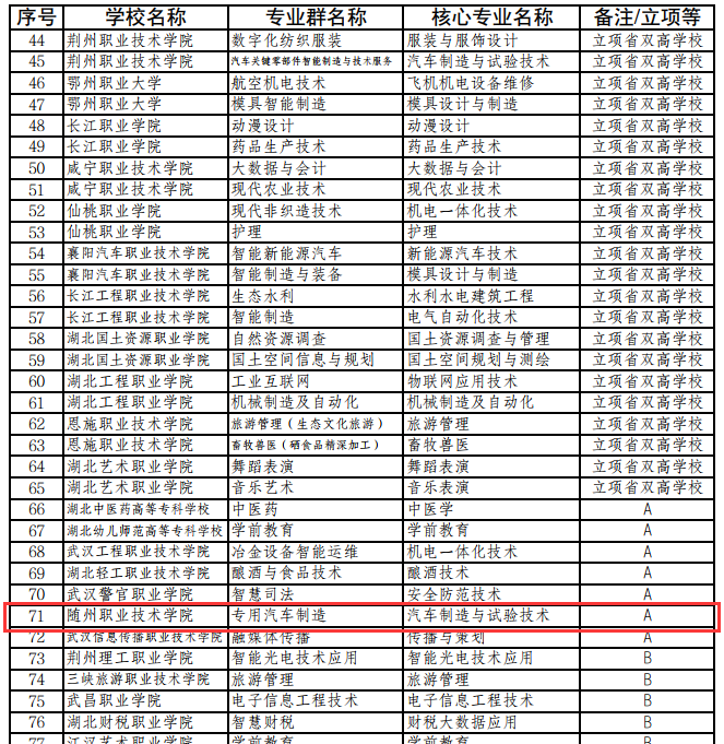 12月14日,从湖北省教育厅获悉,根据省教育厅、省财政厅印发的《湖北省高水平高职院校和专业群建设计划实施方案》(鄂教职成〔2021〕1号),经学校申报、专家评审等程序,拟确定29所高职院校立项建设省级高水平高职学校,84个专业群立项建设省级高水平专业群。我院专用汽车制造专业群获批立项。