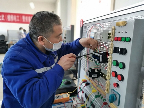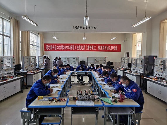 1214日,湖北新兴全力机械有限公司2021年职工技能比武在我院开放式电工实训室2110举行,机加、铸造等车间维修电工、机修工、操作工等工种近30人参加比武活动。