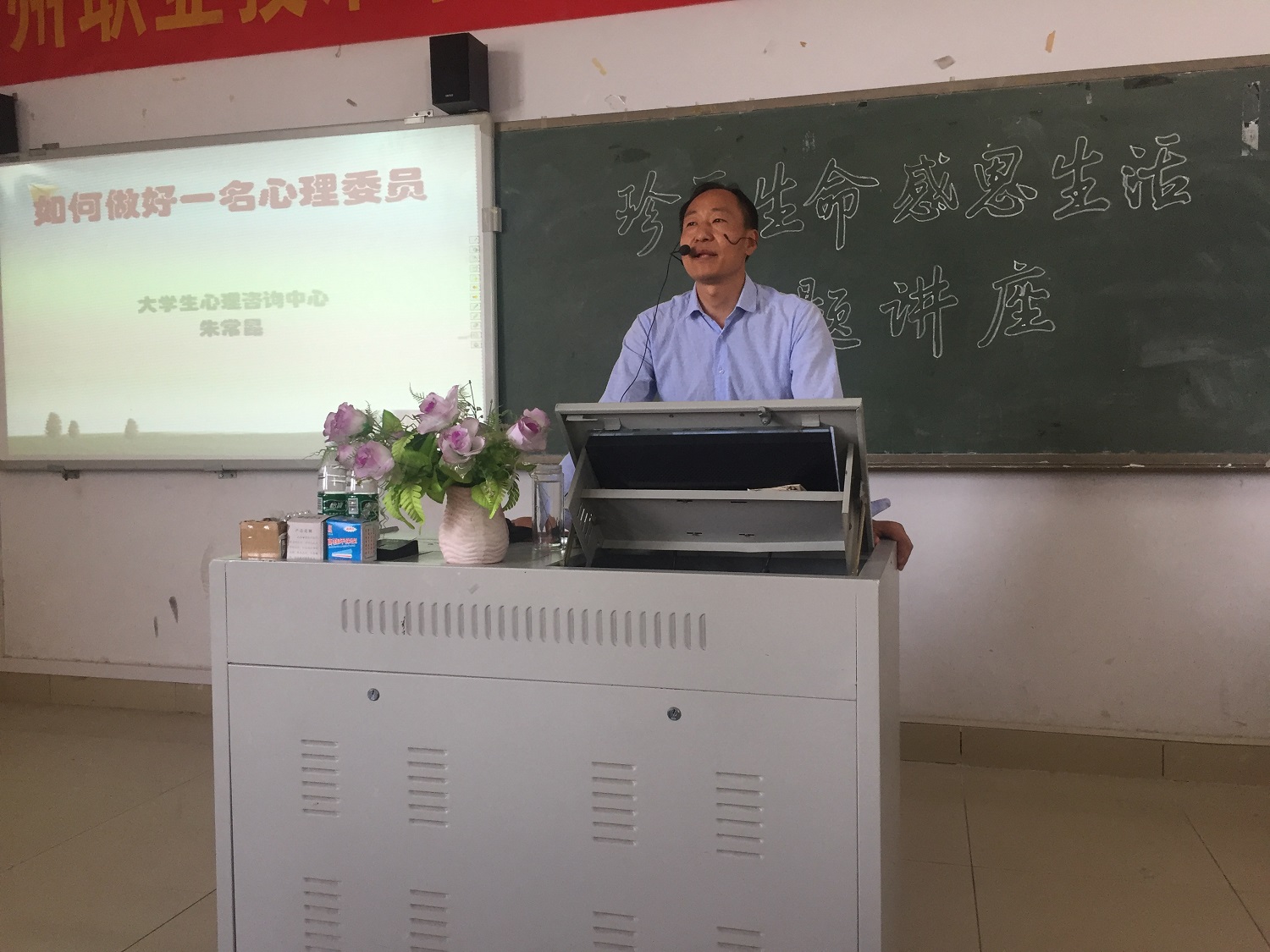 本次心理健康教育讲座主题是:如何做好一名心理委员。首先,朱教授就我院大学生心理现状进行了分析;接着朱教授肯定了各心理委员的作用,并在此基础上提出了心理委员的责任和具体任务;然后,朱教授教会学生如何识别心理危机,并介绍了心理委员在工作中的有效方法和途径;最后,朱教授对心理委员提出了具体的要求。