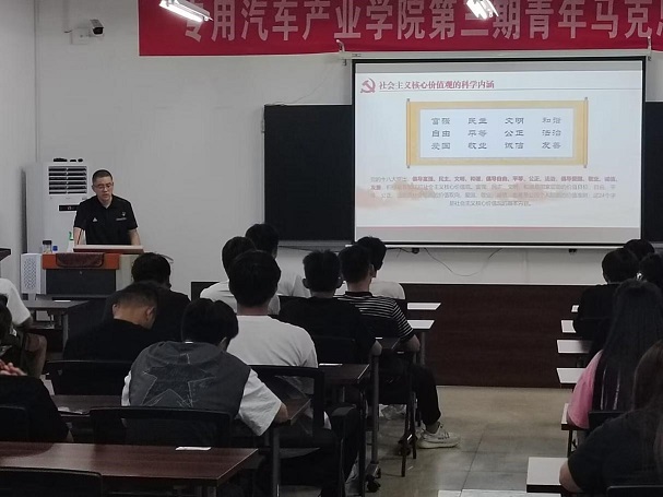 为深入学习贯彻党的二十大精神,培育引导学生积极践行社会主义核心价值观, 520日晚上七点,专用汽车产业学院党总支副书记王军在2202会议室为入党积极分子、学生干部、各班学生代表作《弘扬社会主义核心价值观》专题讲座。